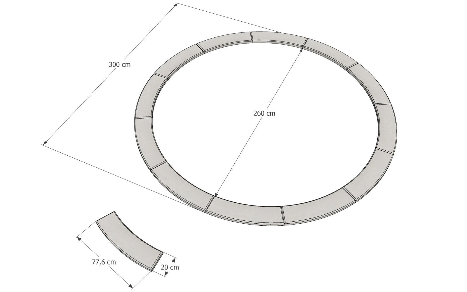 Zestaw składa się z 12 idealnie dopasowanych elementów, które tworzą pełny okrąg o średnicy 3 m. Montaż jest szybki i bezproblemowy – wystarczy ułożyć elementy na odpowiednio przygotowanym podłożu.