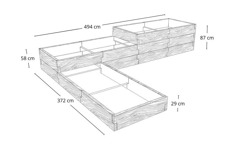 Aby stworzyć warzywnik o długości 372 cm, wysokości 29 cm i szerokości 128 cm, potrzebujesz łącznie 8 modułów po 128 cm (po trzy moduły na dłuższych bokach, po jednym module na krótszych). Na dłuższych bokach będą dwa łączenia, dlatego ostateczna długość wyniesie dokładnie 372 cm (128 + 128 + 128 – 2 x 6 cm).