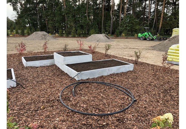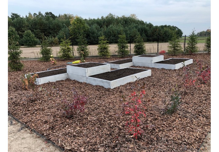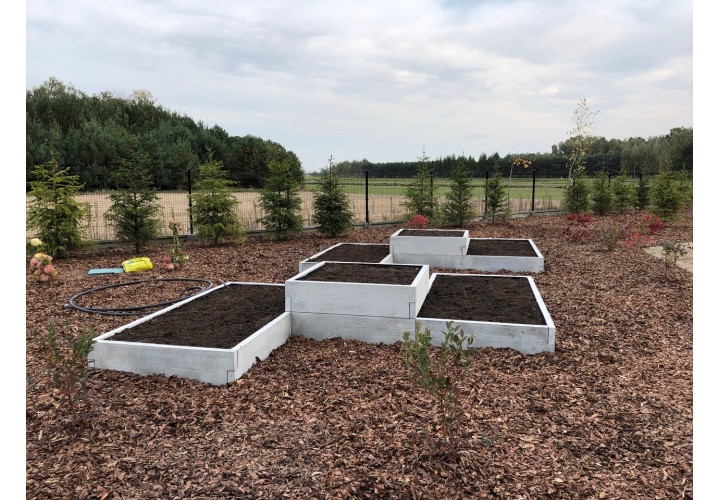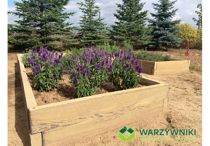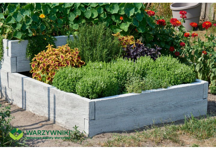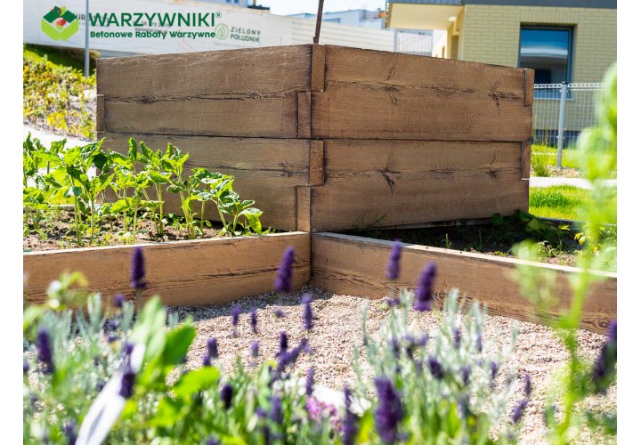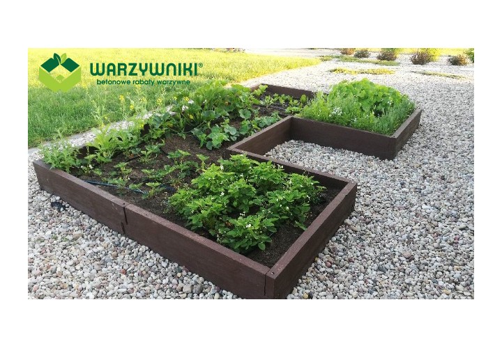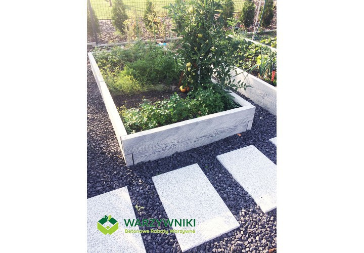 Ten warzywnik pozwala raz zaplanować ogród i korzystać z niego przez wiele sezonów. Betonowa konstrukcja jest trwała, a wygląd imitujący deskę sprawia, że całość nie wygląda „ciężko” ani surowo. Jeśli z czasem pojawi się potrzeba rozbudowy, kolejne elementy można bez problemu dołożyć i stworzyć nowy układ. Warzywnik można także połączyć z kompostownikami z tej samej serii, tworząc spójną i praktyczną przestrzeń ogrodową.