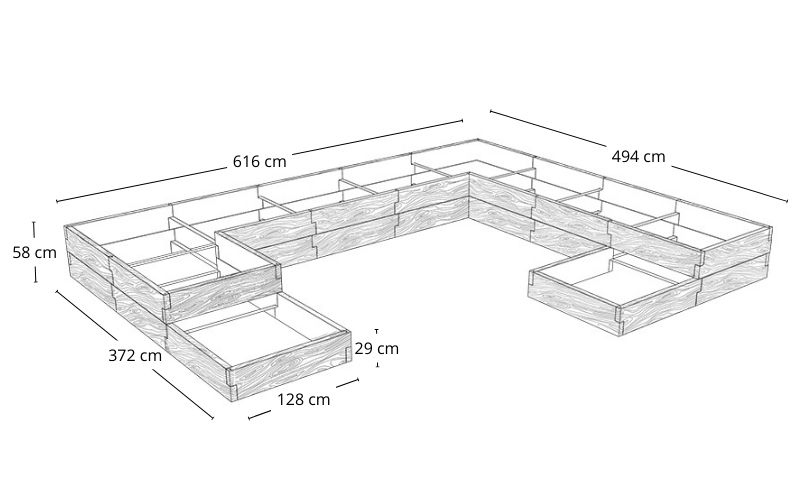 Aby stworzyć warzywnik o długości 372 cm, wysokości 29 cm i szerokości 128 cm, potrzebujesz łącznie 8 modułów po 128 cm (po trzy moduły na dłuższych bokach, po jednym module na krótszych). Na dłuższych bokach będą dwa łączenia, dlatego ostateczna długość wyniesie dokładnie 372 cm (128 + 128 + 128 – 2 x 6 cm).