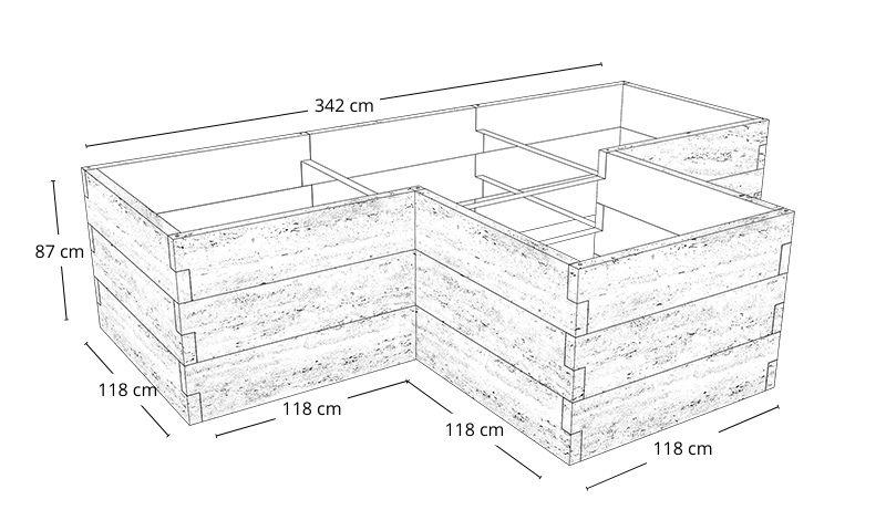 Aby stworzyć warzywnik o długości 342 cm, wysokości 29 cm i szerokości 118 cm, potrzebujesz łącznie 8 modułów po 118 cm (po trzy  moduły na dłuższych bokach, po jednym module na krótszych). Na dłuższych bokach będą dwa łączenia, dlatego ostateczna długość wyniesie dokładnie 342 cm (118 + 118 + 118 – 2 x 6 cm).
