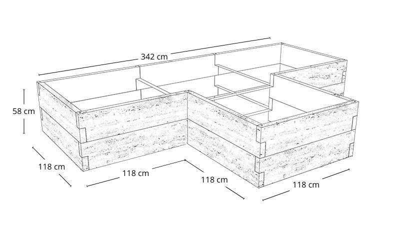 Aby stworzyć warzywnik o długości 342 cm, wysokości 29 cm i szerokości 118 cm, potrzebujesz łącznie 8 modułów po 118 cm (po trzy moduły na dłuższych bokach, po jednym module na krótszych). Na dłuższych bokach będą dwa łączenia, dlatego ostateczna długość wyniesie dokładnie 342 cm (118 + 118 + 118 – 2 x 6 cm).
