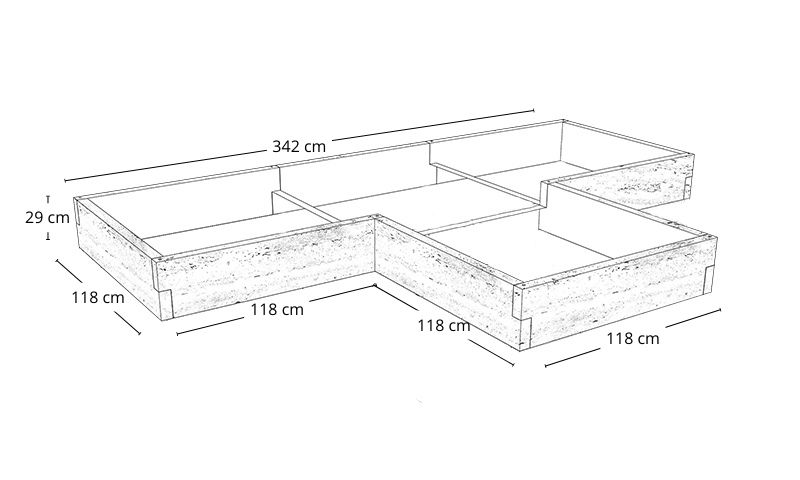 Aby stworzyć warzywnik o długości 342 cm, wysokości 29 cm i szerokości 118 cm, potrzebujesz łącznie 8 modułów po 118 cm (po trzy moduły na dłuższych bokach, po jednym module na krótszych). Na dłuższych bokach będą dwa łączenia, dlatego ostateczna długość wyniesie dokładnie 342 cm (118 + 118 + 118 – 2 x 6 cm).