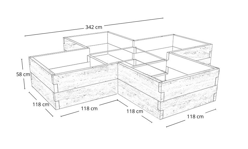 Aby stworzyć warzywnik o długości 342 cm, wysokości 29 cm i szerokości 118 cm, potrzebujesz łącznie 8 modułów po 118 cm (po trzy moduły na dłuższych bokach, po jednym module na krótszych). Na dłuższych bokach będą dwa łączenia, dlatego ostateczna długość wyniesie dokładnie 342 cm (118 + 118 + 118 – 2 x 6 cm).