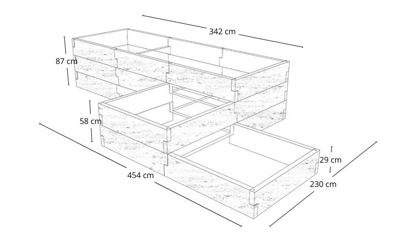 Aby stworzyć warzywnik o długości 342 cm, wysokości 29 cm i szerokości 118 cm, potrzebujesz łącznie 8 modułów po 118 cm (po trzy moduły na dłuższych bokach, po jednym module na krótszych). Na dłuższych bokach będą dwa łączenia, dlatego ostateczna długość wyniesie dokładnie 342 cm (118 + 118 + 118 – 2 x 6 cm).