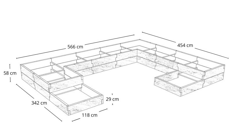 Aby stworzyć warzywnik o długości 342 cm, wysokości 29 cm i szerokości 118 cm, potrzebujesz łącznie 8 modułów po 118 cm (po trzy moduły na dłuższych bokach, po jednym module na krótszych). Na dłuższych bokach będą dwa łączenia, dlatego ostateczna długość wyniesie dokładnie 342 cm (118 + 118 + 118 – 2 x 6 cm).