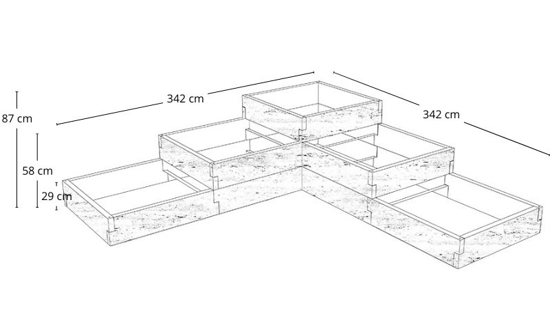 Aby stworzyć warzywnik o długości 342 cm, wysokości 29 cm i szerokości 118 cm, potrzebujesz łącznie 8 modułów po 118 cm (po trzy  moduły na dłuższych bokach, po jednym module na krótszych). Na dłuższych bokach będą dwa łączenia, dlatego ostateczna długość wyniesie dokładnie 342 cm (118 + 118 + 118 – 2 x 6 cm).