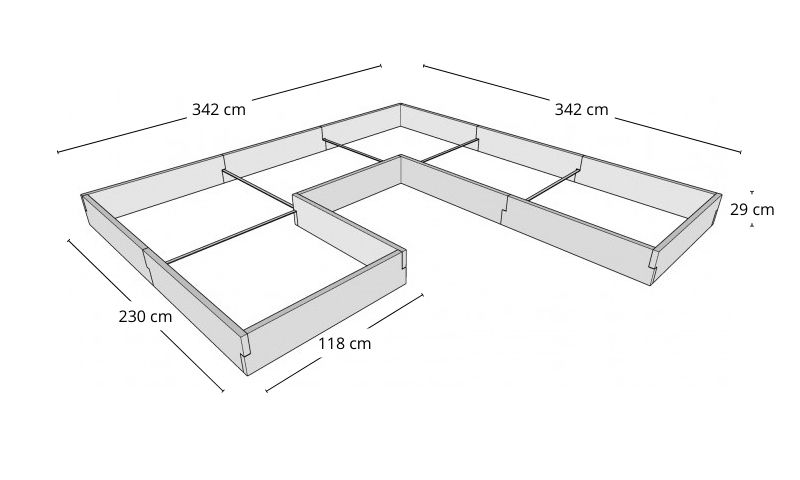 Aby stworzyć warzywnik o długości 342 cm, wysokości 29 cm i szerokości 118 cm, potrzebujesz łącznie 8 modułów po 118 cm (po trzy moduły na dłuższych bokach, po jednym module na krótszych). Na dłuższych bokach będą dwa łączenia, dlatego ostateczna długość wyniesie dokładnie 342 cm (118 + 118 + 118 – 2 x 6 cm).
