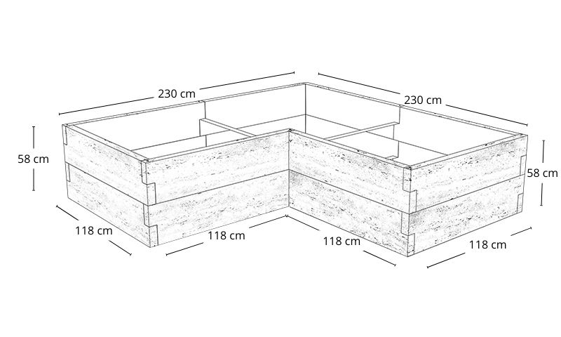 Aby stworzyć warzywnik o długości 342 cm, wysokości 29 cm i szerokości 118 cm, potrzebujesz łącznie 8 modułów po 118 cm (po trzy moduły na dłuższych bokach, po jednym module na krótszych). Na dłuższych bokach będą dwa łączenia, dlatego ostateczna długość wyniesie dokładnie 342 cm (118 + 118 + 118 – 2 x 6 cm).