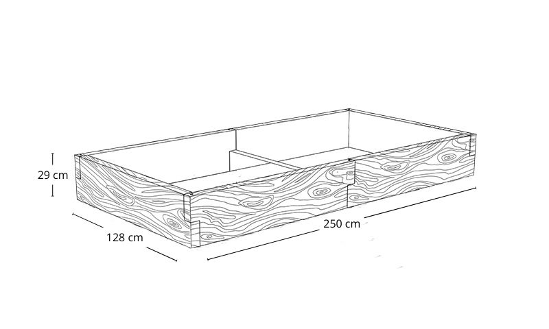 Aby stworzyć warzywnik o długości 372 cm, wysokości 29 cm i szerokości 128 cm, potrzebujesz łącznie 8 modułów po 128 cm (po trzy moduły na dłuższych bokach, po jednym module na krótszych). Na dłuższych bokach będą dwa łączenia, dlatego ostateczna długość wyniesie dokładnie 372 cm (128 + 128 + 128 – 2 x 6 cm).