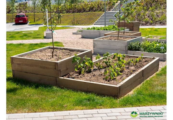 Ten warzywnik pozwala raz zaplanować przestrzeń ogrodu i korzystać z niej przez wiele sezonów. Betonowa konstrukcja jest solidna i odporna na warunki atmosferyczne, a wykończenie imitujące deskę sprawia, że całość wygląda naturalnie i estetycznie. Warzywnik można także połączyć z kompostownikami z tej samej serii, tworząc spójną i funkcjonalną strefę ogrodu użytkowego.