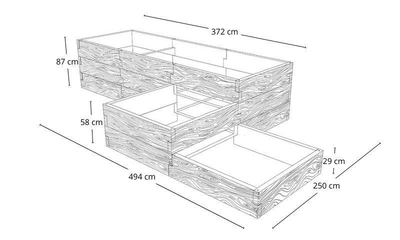 Aby stworzyć warzywnik o długości 372 cm, wysokości 29 cm i szerokości 128 cm, potrzebujesz łącznie 8 modułów po 128 cm (po trzy moduły na dłuższych bokach, po jednym module na krótszych). Na dłuższych bokach będą dwa łączenia, dlatego ostateczna długość wyniesie dokładnie 372 cm (128 + 128 + 128 – 2 x 6 cm).