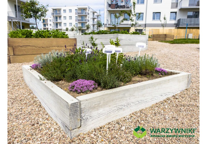 Ten warzywnik pozwala raz zaplanować ogród i korzystać z niego przez wiele sezonów, bez ciągłych napraw i wymiany skrzyń. Betonowa konstrukcja jest trwała, a wygląd imitujący deskę sprawia, że całość naturalnie wpisuje się w otoczenie. Warzywnik można także połączyć z kompostownikami z tej samej serii, tworząc spójną i funkcjonalną przestrzeń ogrodową.