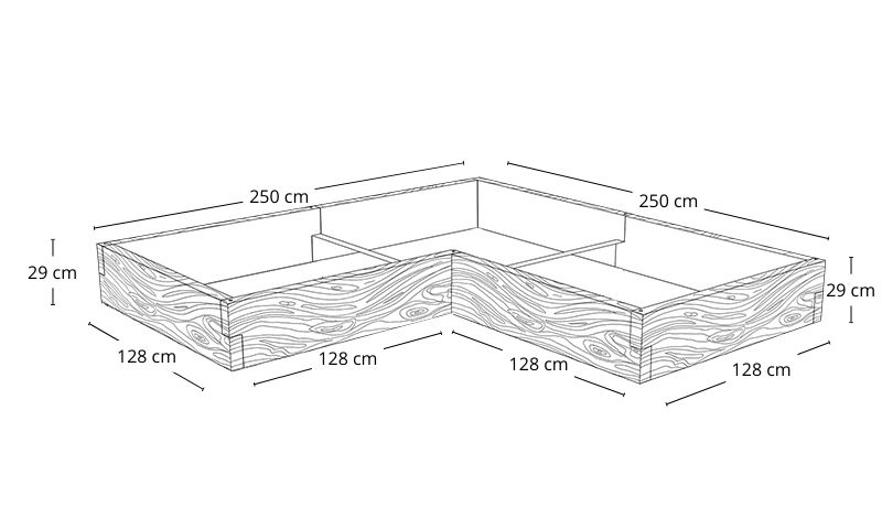Aby stworzyć warzywnik o długości 372 cm, wysokości 29 cm i szerokości 128 cm, potrzebujesz łącznie 8 modułów po 128 cm (po trzy moduły na dłuższych bokach, po jednym module na krótszych). Na dłuższych bokach będą dwa łączenia, dlatego ostateczna długość wyniesie dokładnie 372 cm (128 + 128 + 128 – 2 x 6 cm).