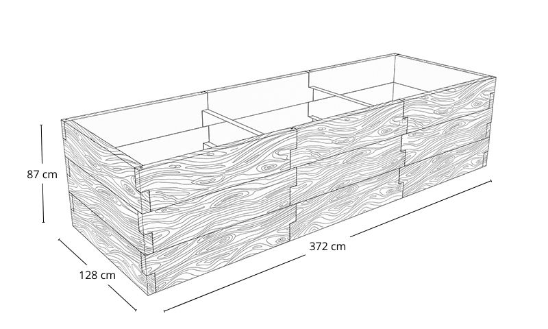 Aby stworzyć warzywnik o długości 372 cm, wysokości 29 cm i szerokości 128 cm, potrzebujesz łącznie 8 modułów po 128 cm (po trzy  moduły na dłuższych bokach, po jednym module na krótszych). Na dłuższych bokach będą dwa łączenia, dlatego ostateczna długość wyniesie dokładnie 372 cm (128 + 128 + 128 – 2 x 6 cm).