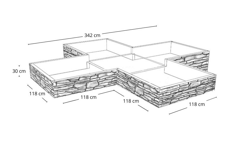 Dzięki modułowej budowie każdy warzywnik możemy w dowolne strony rozbudowywać, tworzyć własne kształty, wysokości oraz stopniowania (piętrowana rabata). Jeden moduł ma wysokość 30 cm i dostępny jest w trzech szerokościach 50cm, 90cm i 118cm. Dzięki różnym szerokościom, z elementów można zbudować donice, kwietniki wokół tarasu lub wykorzystać warzywnik jako kompostownik.