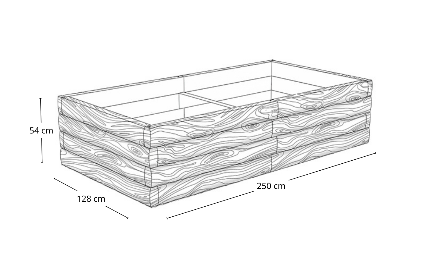 Segment  warzywnika ma długość, szerokość i wysokość. Na przykład, jeden segment  może mieć wymiary 90 cm x 90 cm x 29 cm (długość x szerokość x wysokość).