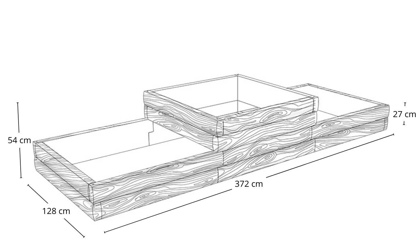 Aby stworzyć warzywnik o długości 372 cm, wysokości 27 cm i szerokości 128 cm, potrzebujesz łącznie 8 modułów po 128 cm (po trzy moduły na dłuższych bokach, po jednym module na krótszych). Na dłuższych bokach będą dwa łączenia, dlatego ostateczna długość wyniesie dokładnie 372 cm (128 + 128 + 128 – 2 x 6 cm).