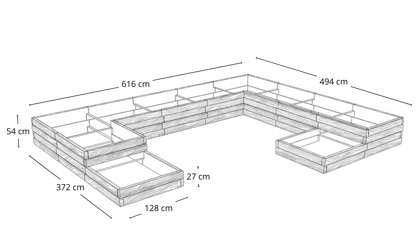 Aby stworzyć warzywnik o długości 372 cm, wysokości 27 cm i szerokości 128 cm, potrzebujesz łącznie 8 modułów po 128 cm (po trzy moduły na dłuższych bokach, po jednym module na krótszych). Na dłuższych bokach będą dwa łączenia, dlatego ostateczna długość wyniesie dokładnie 372 cm (128 + 128 + 128 – 2 x 6 cm).