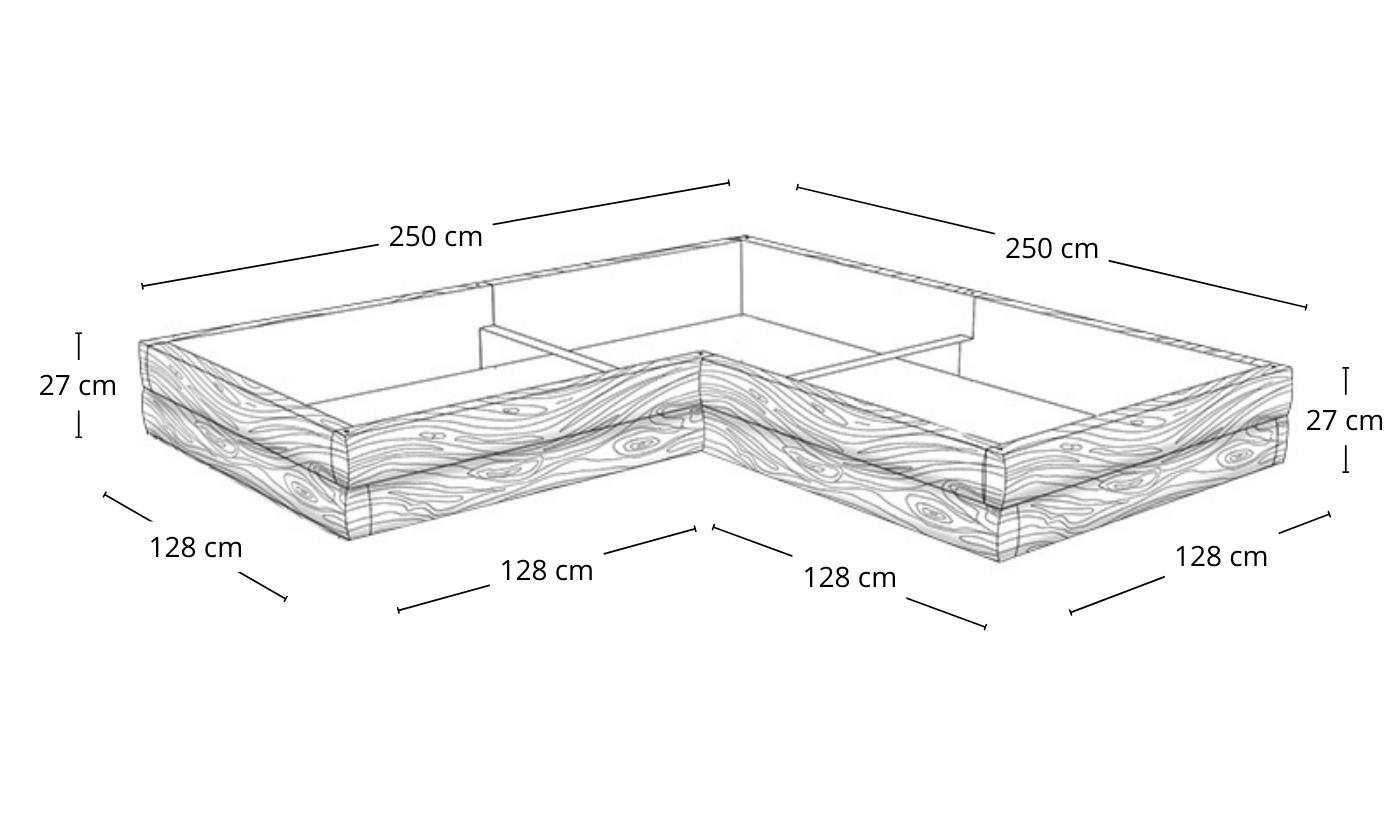 Aby stworzyć warzywnik o długości 372 cm, wysokości 27 cm i szerokości 128 cm, potrzebujesz łącznie 8 modułów po 128 cm (po trzy  moduły na dłuższych bokach, po jednym module na krótszych). Na dłuższych bokach będą dwa łączenia, dlatego ostateczna długość wyniesie dokładnie 372 cm (128 + 128 + 128 – 2 x 6 cm).