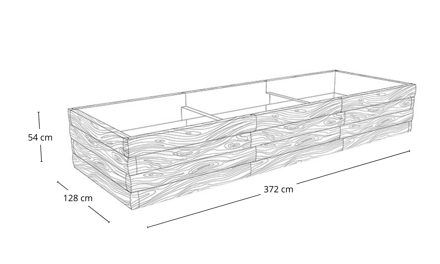 Aby stworzyć warzywnik o długości 372 cm, wysokości 27 cm i szerokości 128 cm, potrzebujesz łącznie 8 modułów po 128 cm (po trzy  moduły na dłuższych bokach, po jednym module na krótszych). Na dłuższych bokach będą dwa łączenia, dlatego ostateczna długość wyniesie dokładnie 372 cm (128 + 128 + 128 – 2 x 6 cm).