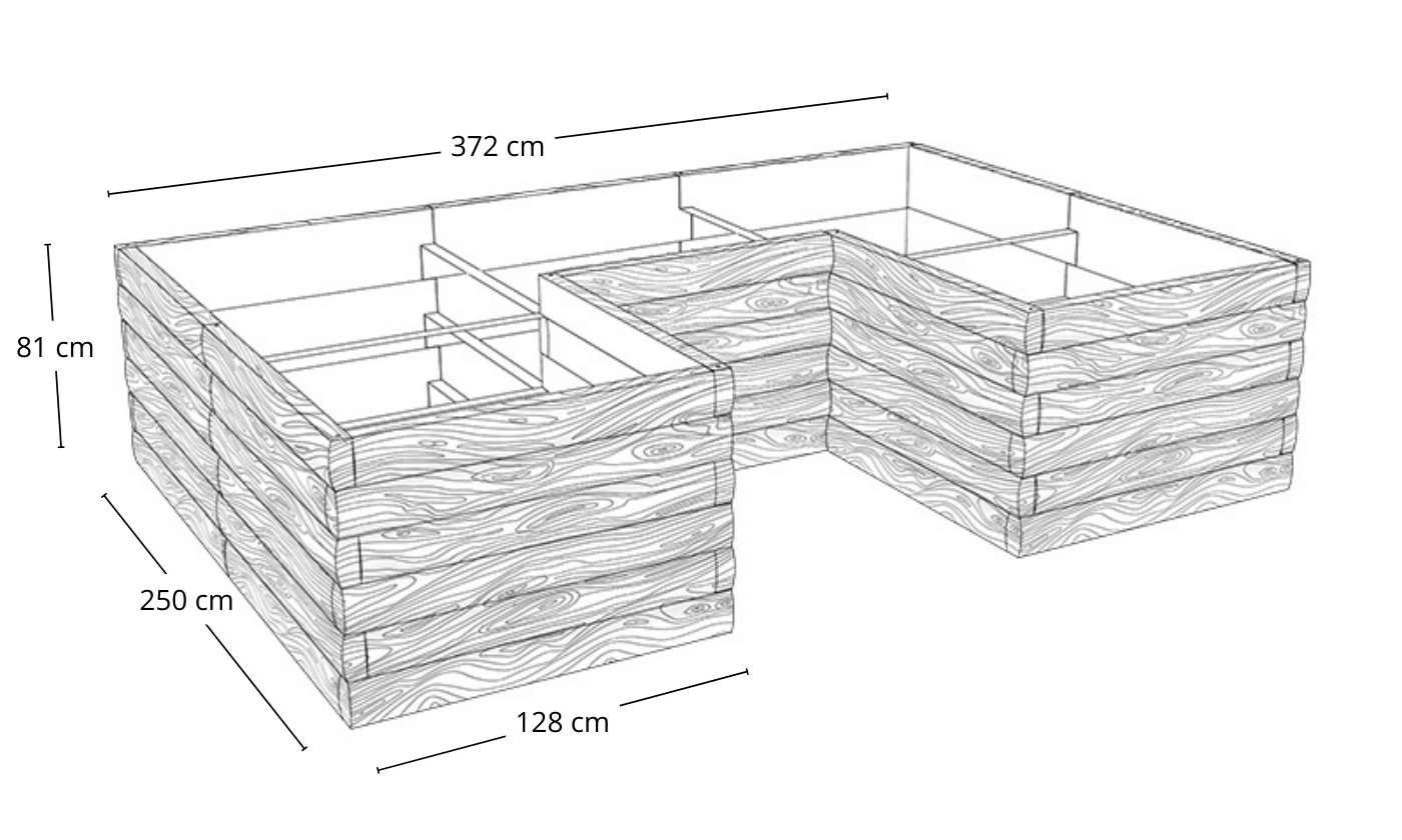 Aby stworzyć warzywnik o długości 372 cm, wysokości 27 cm i szerokości 128 cm, potrzebujesz łącznie 8 modułów po 128 cm (po trzy moduły na dłuższych bokach, po jednym module na krótszych). Na dłuższych bokach będą dwa łączenia, dlatego ostateczna długość wyniesie dokładnie 372 cm (128 + 128 + 128 – 2 x 6 cm).