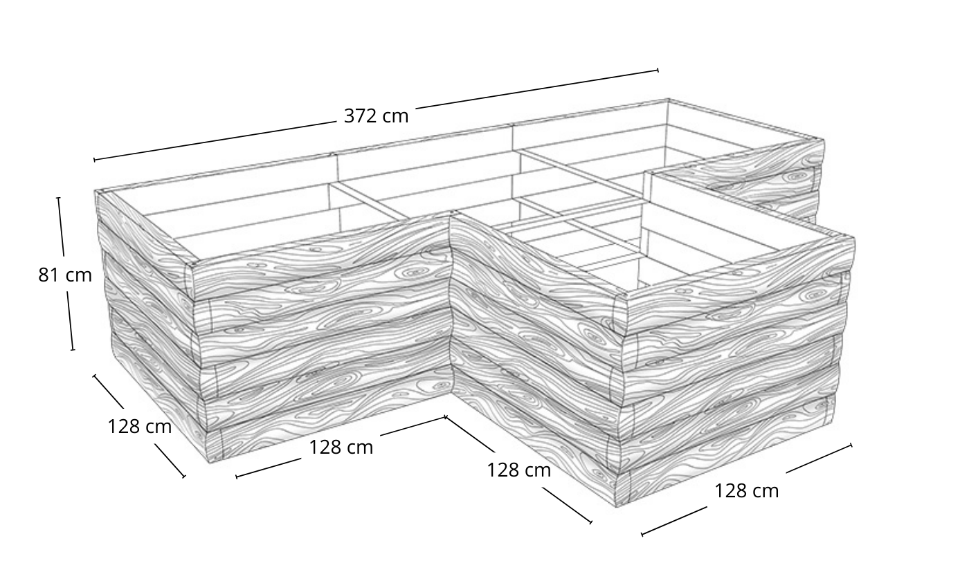 Aby stworzyć warzywnik o długości 372 cm, wysokości 27 cm i szerokości 128 cm, potrzebujesz łącznie 8 modułów po 128 cm (po trzy moduły na dłuższych bokach, po jednym module na krótszych). Na dłuższych bokach będą dwa łączenia, dlatego ostateczna długość wyniesie dokładnie 372 cm (128 + 128 + 128 – 2 x 6 cm).