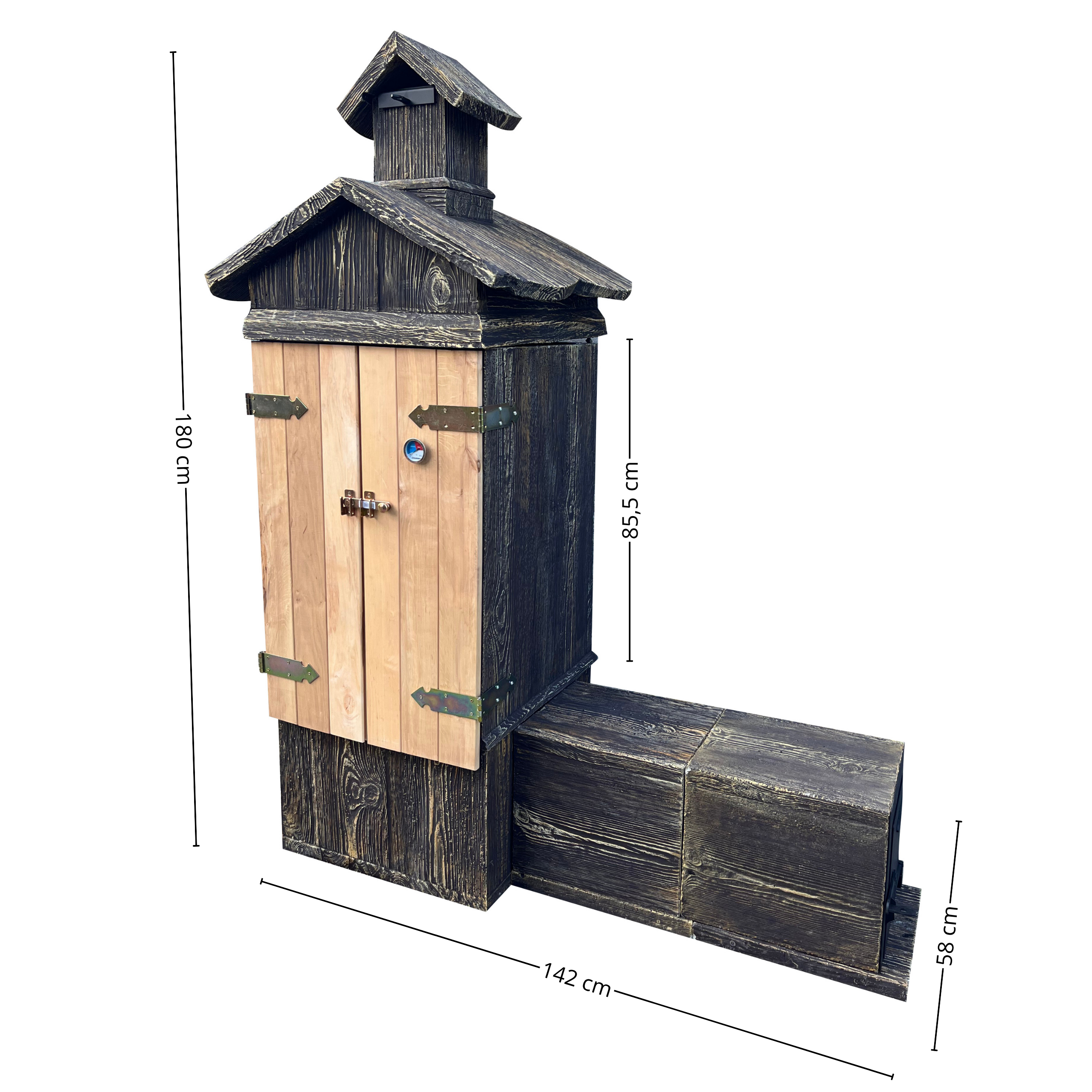 Wędzarnia została wykonana z wysokiej jakości betonu wzmacnianego stalą, odpornego na deszcz, mróz i upływ czasu. Realistyczna imitacja deski sprawia, że konstrukcja wygląda jak tradycyjna wędzarnia z drewna – ale bez konieczności impregnacji, bez pękania, bez problemów typowych dla drewna.